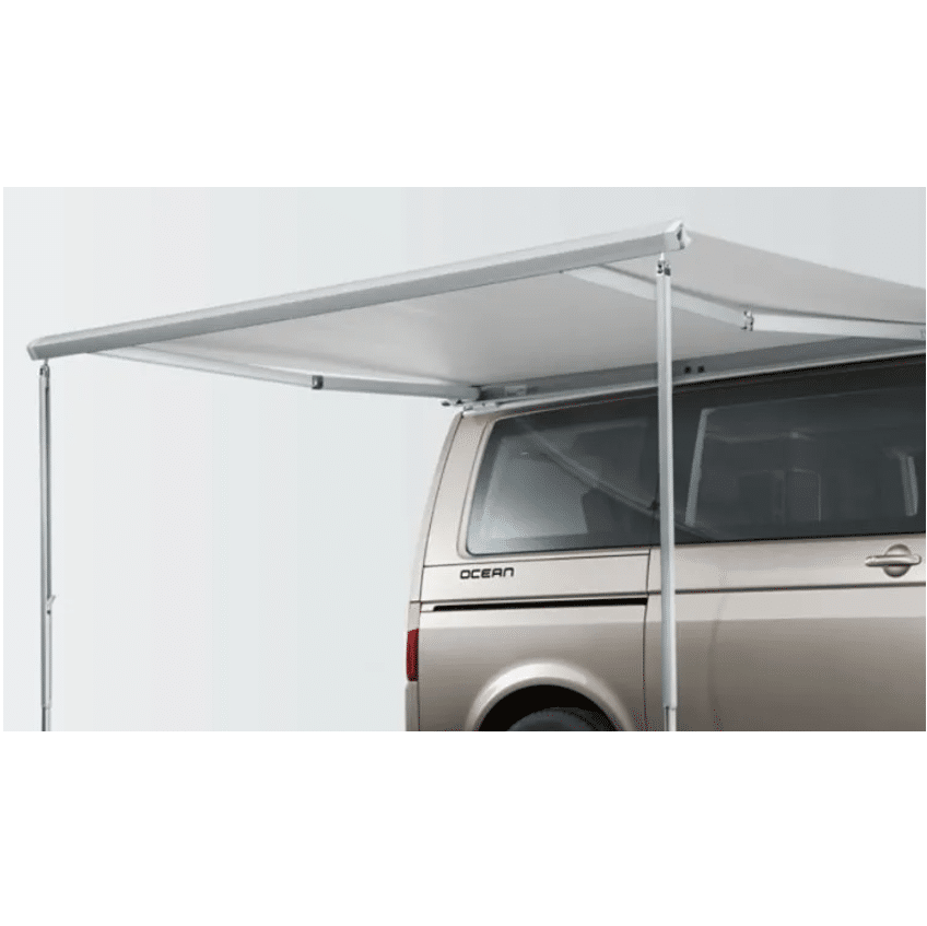 The VW California awning is a retractable, weather-resistant canopy designed to provide shade and shelter for the VW California camper. Mounted on the side of the vehicle, it extends easily to create an outdoor living space, making camping more comfortable in various weather conditions.