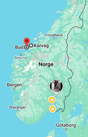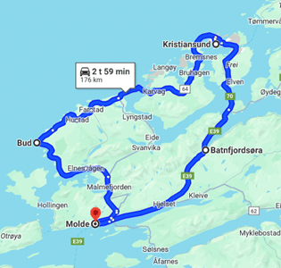 The Atlantic road itself is no more than 8,3 kilometers, from Vevang to Karvåg. If you want to explore this fascinating area, you could consider a daytrip starting from Molde to Bud, crossing The Atlantic Road, and continuing to Kristiansund. Returning to Molde via Batnfjordsøra. This route includes a ferry, crossing Kvernesfjorden.
